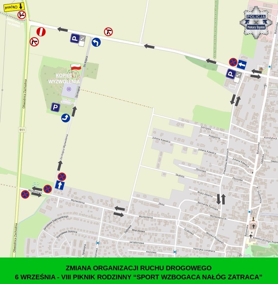 W związku z organizowanym w sobotę 6 września Piknikiem Rodzinnym "Sport wzbogaca-nałóg zatraca" na terenie Kopca Wyzwolenia, wprowadzona zostanie tymczasowa zmiana organizacji ruchu przy ul. Jana Pawła II od skrzyżowania z ul. Inwalidów Wojennych do Drogi Wojewódzkiej nr 911 oraz na ul. Do Kopca Wyzwolenia. Prosimy zachować szczególną ostrożność i stosować się do wprowadzonych zmian.