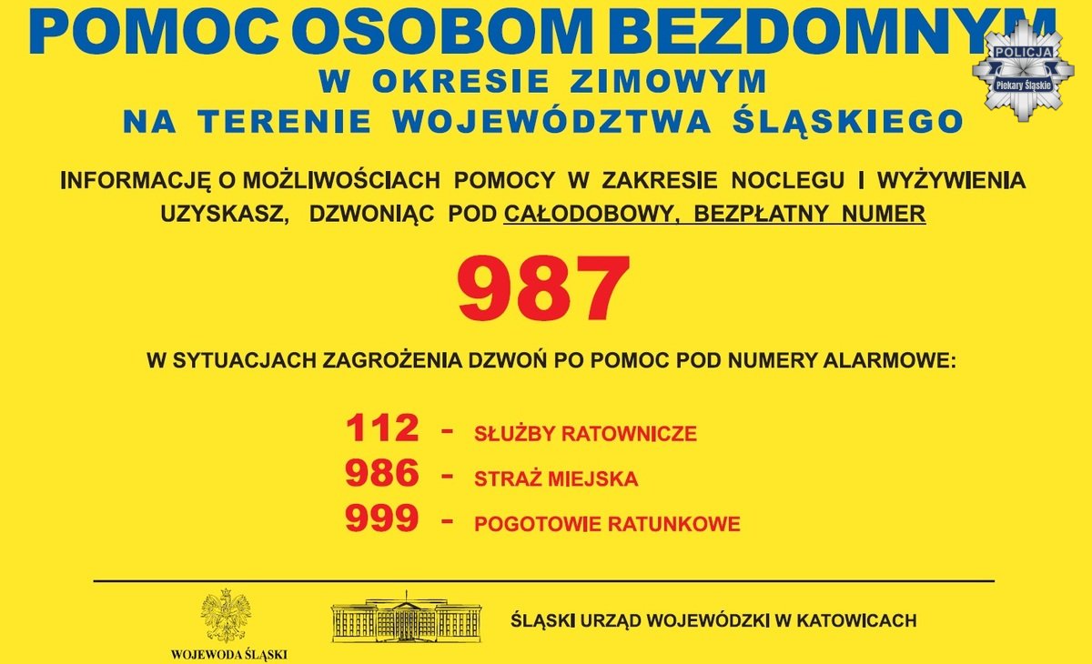 W okresie zimowym, gdy temperatura spada poniżej zera, mundurowi nie pozostają obojętni na los osób potrzebujących pomocy, szczególnie tych narażonych na zamarznięcie. Policjanci, w czasie różnych interwencji i kontroli miejsc, gdzie przebywają bezdomni, informują ich o możliwości skorzystania z różnego rodzaju noclegowni. Śląski Urząd Wojewódzki w Katowicach, wzorem lat ubiegłych, 1 listopada uruchomił bezpłatną infolinię, gdzie bezdomni mogą uzyskać pomoc w zakresie noclegu i wyżywienia.